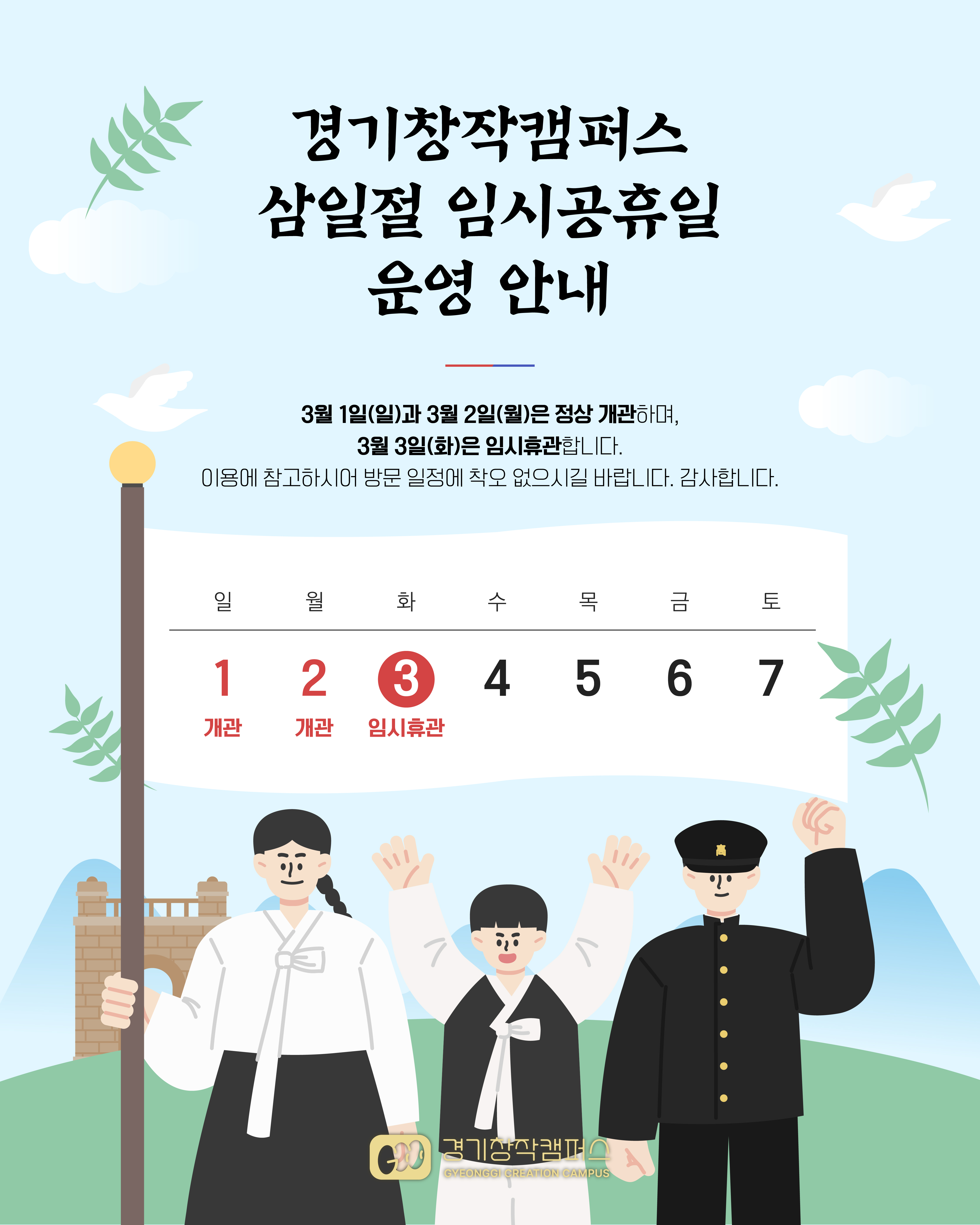 경기창작캠퍼스는 2026년 삼일절 및 대체공휴일에 아래와 같이 운영합니다. 캠퍼스 방문에 참고하여 주시길 바랍니다.
