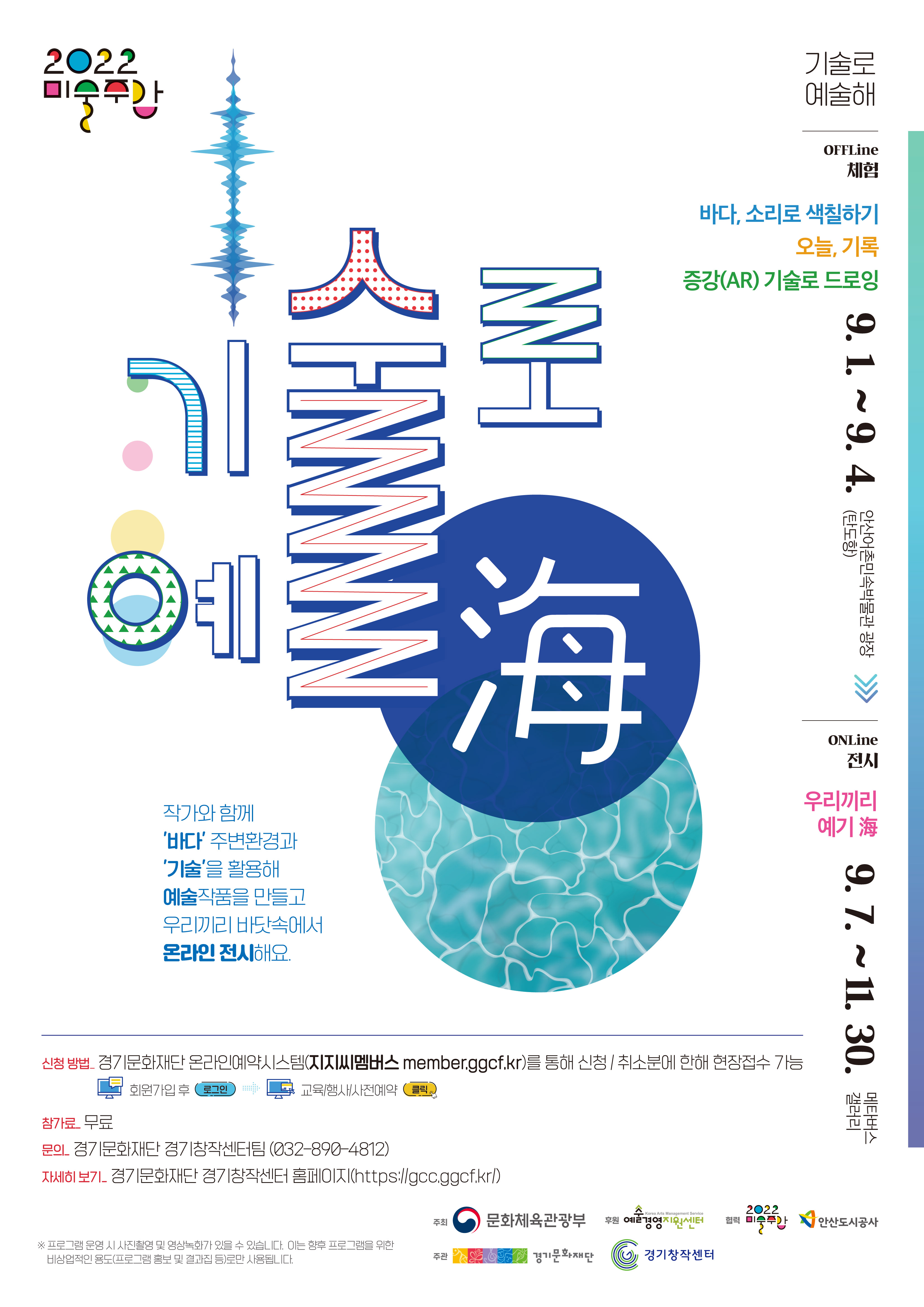 (재)경기문화재단 경기창작센터는 문화체육관광부가 주관하는 2022년 미술주간 ‘예술+기술’ 관람객 체험형 프로그램 공모에 선정되어 9.1.~9.4. 동안 탄도항 안산어촌민속박물관 광장에서 <기술로 예술 海>프로그램을 운영한다. 체험객들은 바다를 콘셉으로 주변환경과 기술을 활용하여 예술작품을 만들고, 작품 결과물은 메타버스 갤러리에 전시된다.