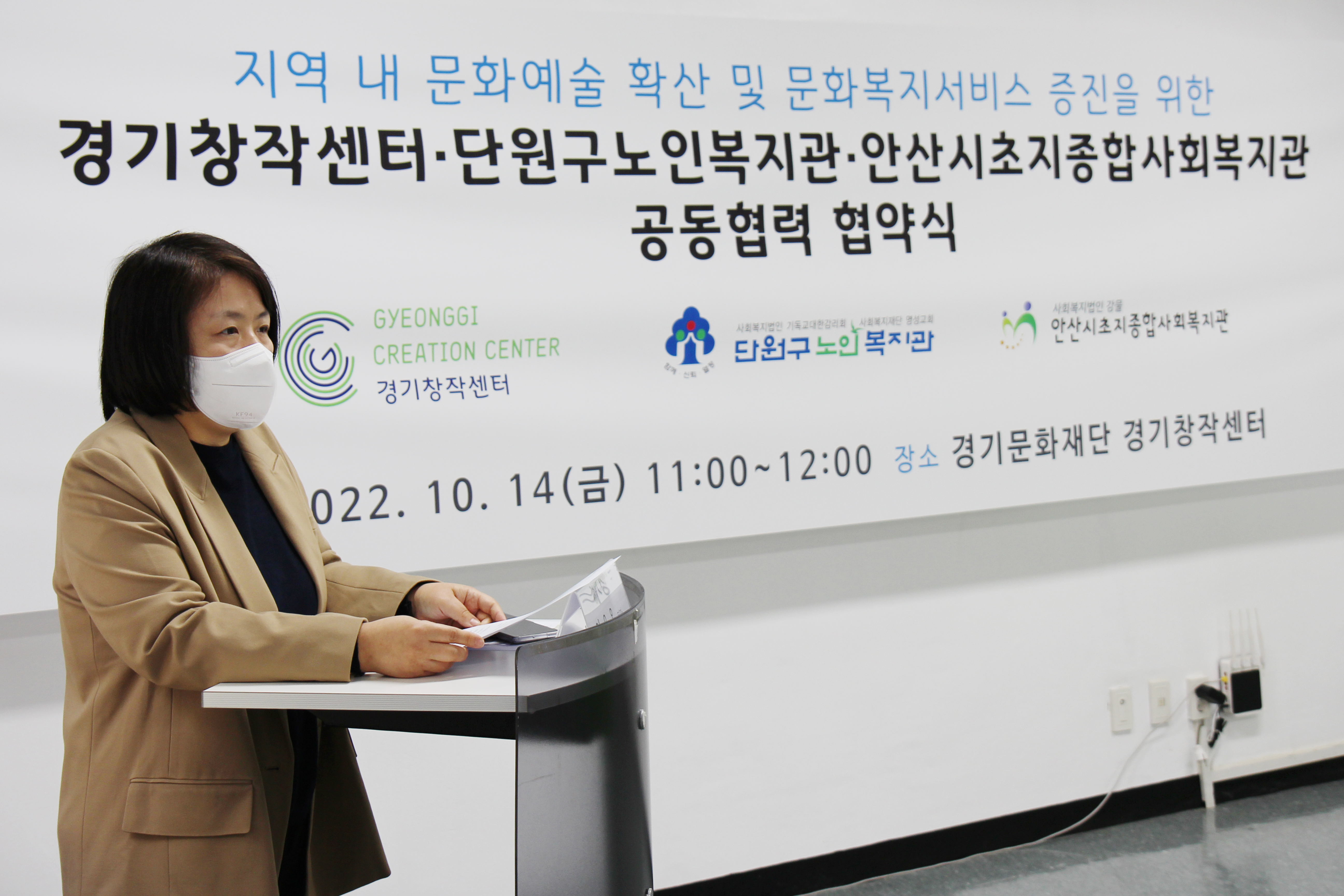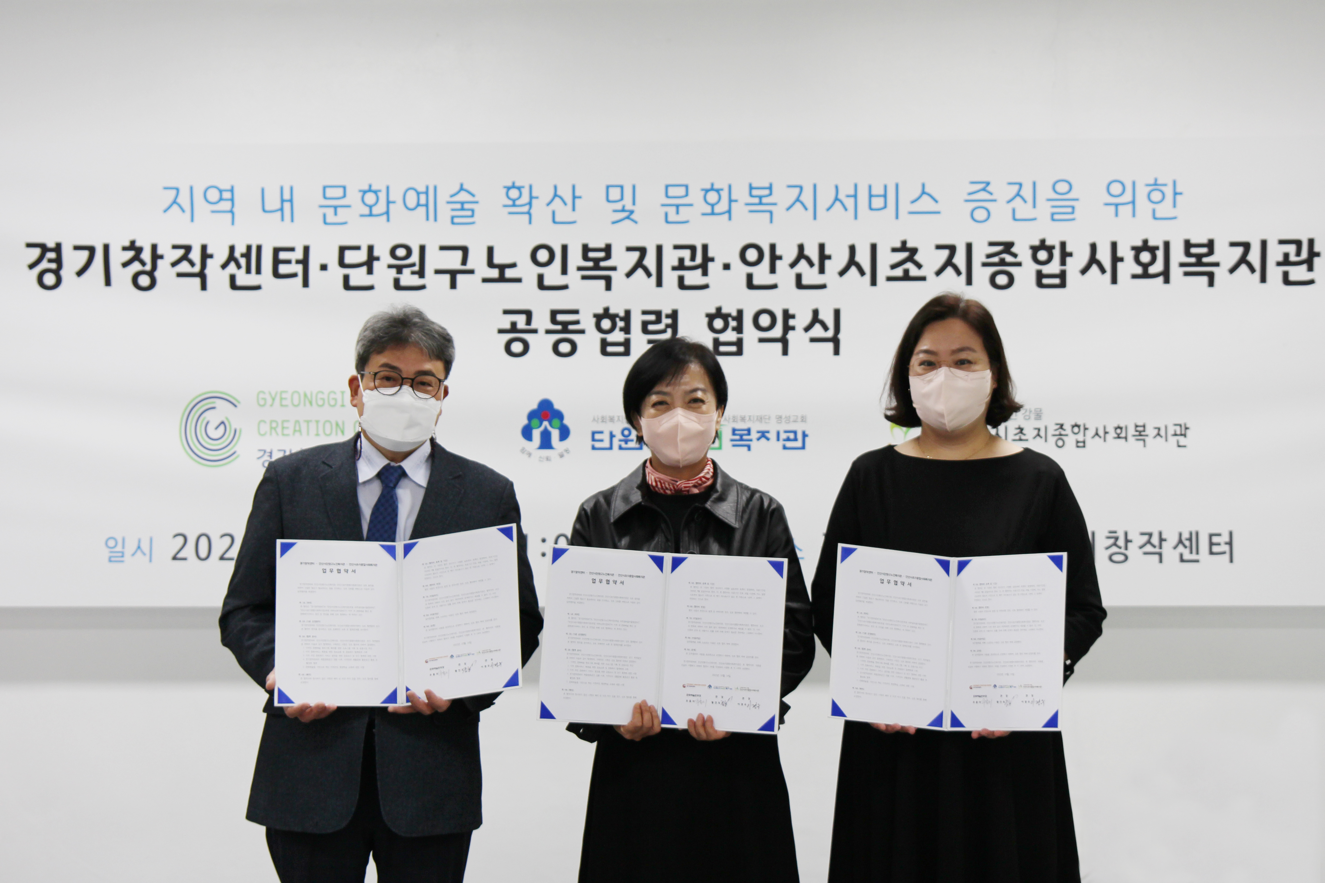 경기문화재단 경기창작센터(문화예술본부장 주홍미)와 안산시단원구노인복지관(관장 황인득)과 안산시초지종합사회복지관(관장 이경우)는 10월 14일 경기창작센터에서 업무협약을 체결했다. 본 협약은 지역민의 문화예술향유기회 확대를 위한 프로그램 기획 및 공동사업 추진, 문화복지서비스 확충을 위한 정보교류를 통해, 지역 문화서비스 발전을 위한 중장기 사업협력 기반을 강화하고자 추진되었다.