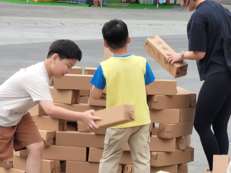 《박스 탑 쌓기》는 본인보다 커다란 구조물을 만들어 무게 중심을 체험하고 중력 및 구조의 중요성을 경험하는 프로그램입니다. 친구들과의 협업이 필요합니다.